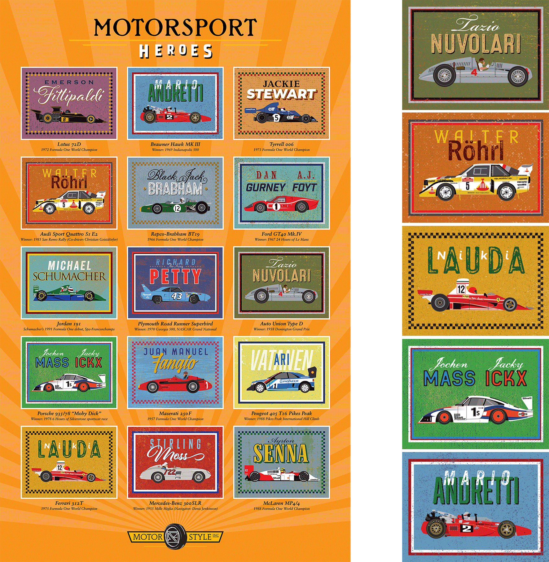 Motorsport Heroes celebrates iconic racing cars and their legendary drivers from various international motorsports. Each panel shows a notable car that either redefined the type of racing it competed in, achieved limited or ongoing success (especially in famous races or championships), or was and still remains extremely popular with fans worldwide.