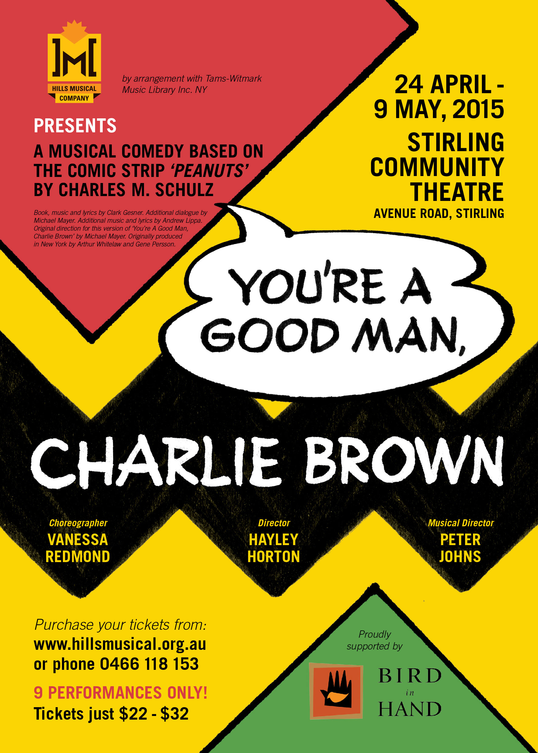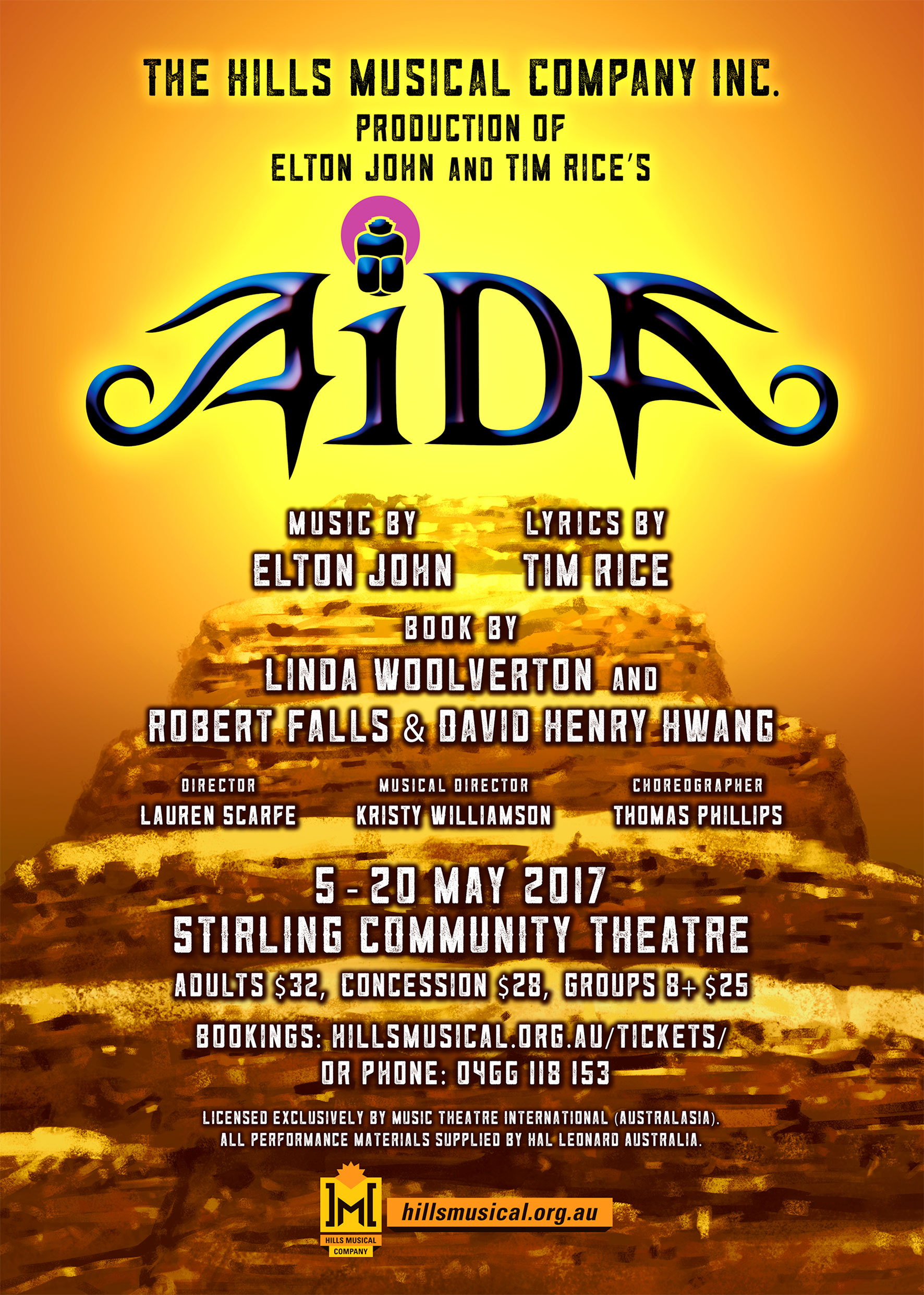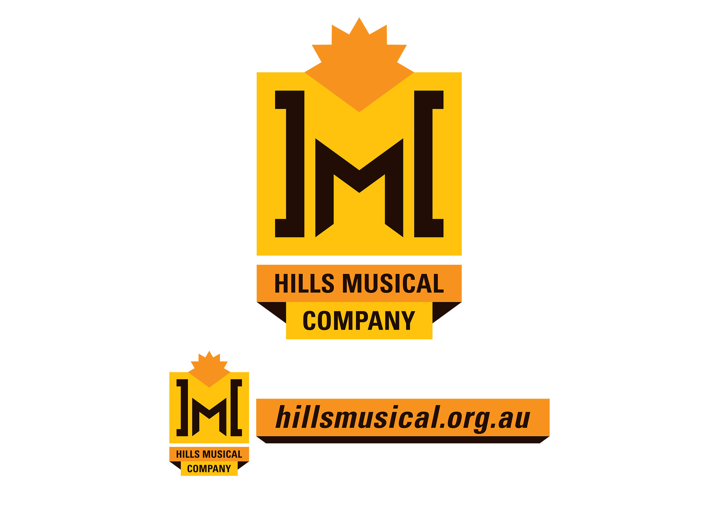 Logo, poster and program designs for the Hills Musical Company. This new identity system features a main logo that can be used with a horizontal webtag, and also includes a version with a white outline for when background colours do not provide suitable contrast.
